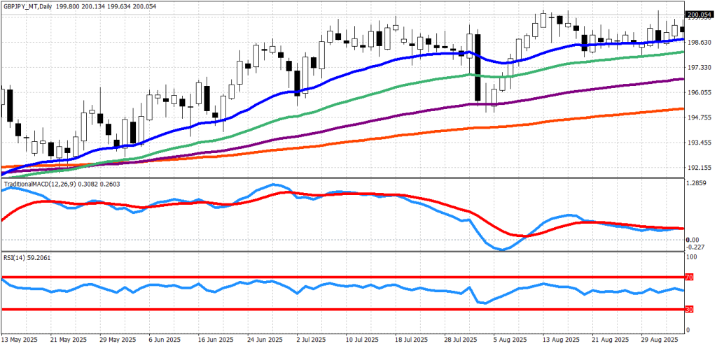 テクニカル的には、日足チャートで25日(青)、50日(緑)、100日(紫)、200日(赤)の4本の移動平均線を上抜けており、地合いは良好です。直近の高値である200.3円付近を明確に上抜ければ、昨年7月に付けた高値である208.1円付近が目標になるでしょう。