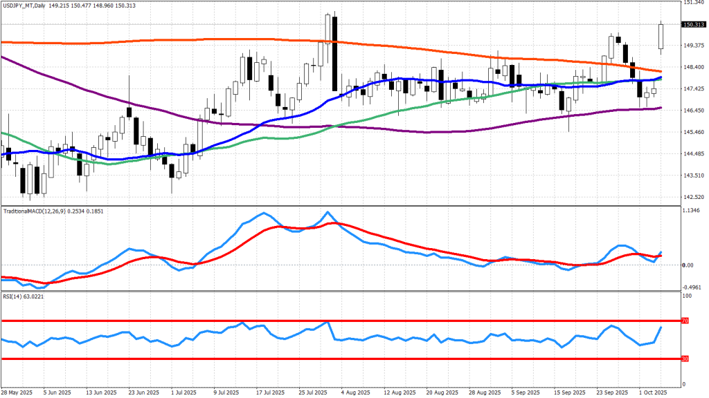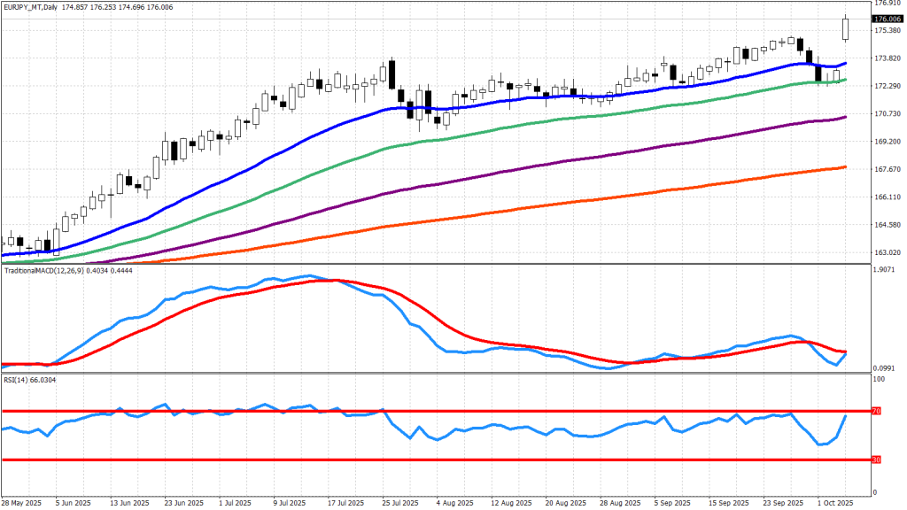 テクニカル的には、日足チャートで25日(青)、50日(緑)、100日(紫)、200日(赤)の4本の移動平均線を上抜け、MACDもゴールデンクロスしており、地合いは依然として非常にいいです。今週は8月1日に付けた高値である150.9円付近を目指しての上昇を予想しますが、高市氏の政策には連立の行方や財源問題など、実現には多くの難題が待ち構えていることを考慮し、丁寧な押し目買いで臨みたいところです。