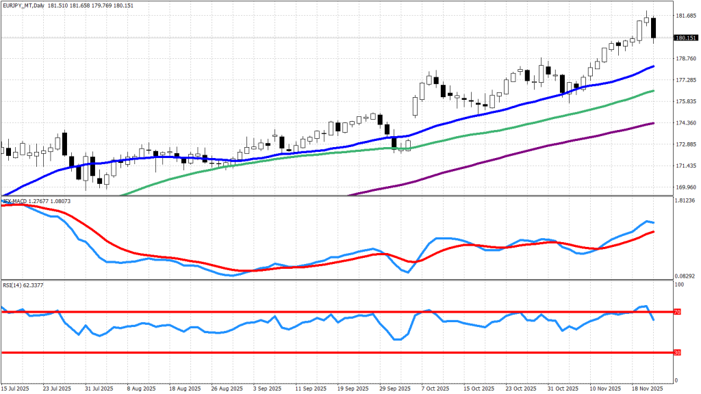 一方、欧州中央銀行(ECB)による利下げサイクルが終了したとみられる点はユーロのサポート材料となり、中々上昇が止まりません。ただし、26日に英国で予算案が提出される予定であり、これの影響を受けて大きな動きを見せる可能性には注意が必要でしょう。