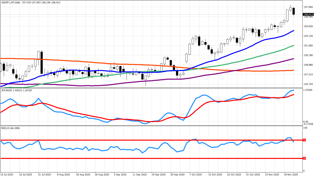 先週のドル円は154.5円付近で始まり、木曜日には157.9円付近まで上昇しました。しかし、その後は一時156.2円付近まで下落し、156.4円付近で週を終えています。日本の2025年度の補正予算が総額21.3兆円と、前年度の13.9兆円を大きく上回るとの報道により、財政に対する不透明感が意識され、円が売られる要因となりました。