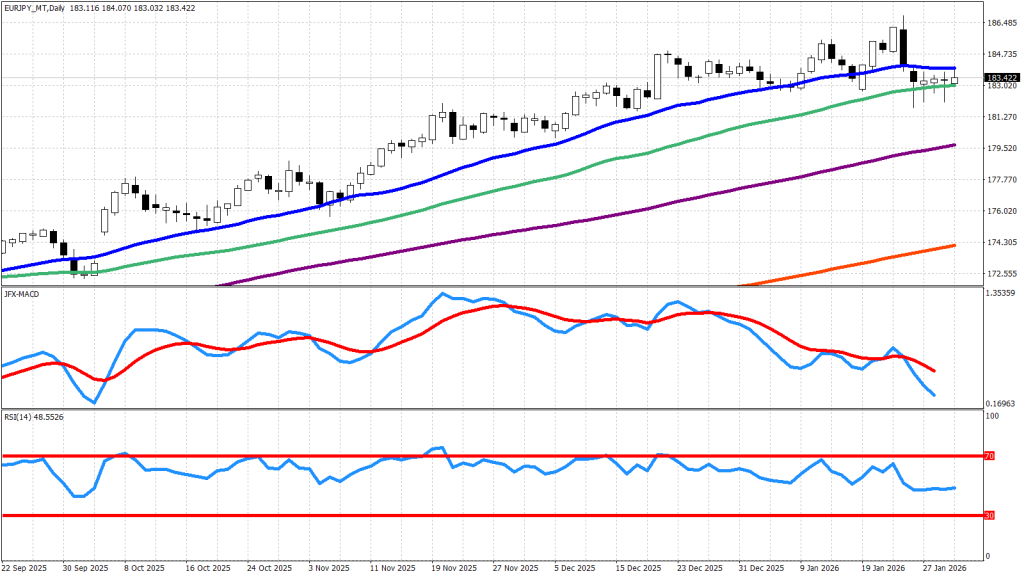 テクニカル的には、日足チャートで25日(青)移動平均線を下抜け、MACDもデッドクロスしており、地合いが悪化してきました。節目であり25日移動平均線も位置する184円付近と、何度も上昇が跳ね返されてきた185.5円は上値抵抗として意識されやすいと考えられるため、ここまで上昇した際は積極的に売りを狙っていくとよいでしょう。