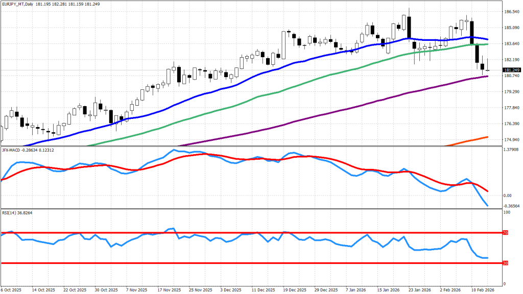 テクニカル的には日足チャートで25日(青)、50日(緑)の2本の移動平均線を下抜け、MACDもデッドクロスしており、地合いが悪化しています。今週は100日移動平均線の上で推移しているなら押し目買い、もし下抜けた場合は節目となる180.0円、昨年11月に付けた安値である176円付近までの下落を想定します。