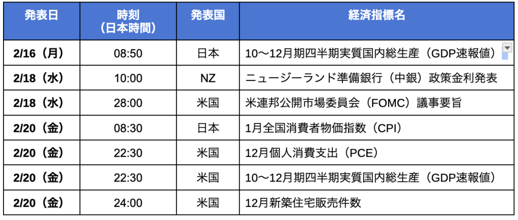 今週は日米の10〜12月期四半期GDPが発表され、これらが利下げ・利上げ観測に影響を与えそうです。日本のGDPが予想を上回る、または米国のGDPが予想を下回れば、ドル円はもう一段下がる可能性もあります。