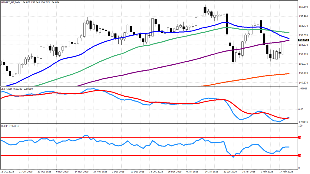 テクニカル的には日足チャートで25日(青)、50日(緑)の2本の移動平均線を下抜けてはいるものの、MACDがゴールデンクロスしており、地合いが回復してきています。今週は2月9日に付けた高値である157.7円付近を目指す展開を予想します。