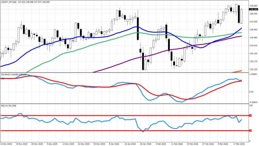 テクニカル的には日足チャートで25日(青)、50日(緑)、100日(紫)、200日(赤)の4本の移動平均線を上抜け、MACDもゴールデンクロスしており、地合いは非常にいいです。今週は昨年7月に付けた高値である161.9円付近を目指す展開を予想します。