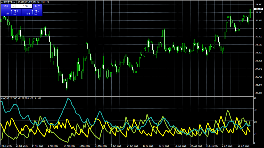 この基準を用いることで、具体的な取引戦略を立てることができます。例えば、チャート上で+DI線が-DI線を下から上に抜け、かつADXの数値が25を超えて上昇し始めた場合、「上昇トレンドが発生した可能性が高いと判断し、買い(順張り)でのエントリーを検討する」というような客観的なルールを構築できます 。逆に、ADXが25以下の低い水準で推移している場合は、トレンドフォロー戦略は機能しにくいため、取引を休むか、レンジ相場向けの逆張り戦略に切り替えるといった判断をするとよいでしょう。