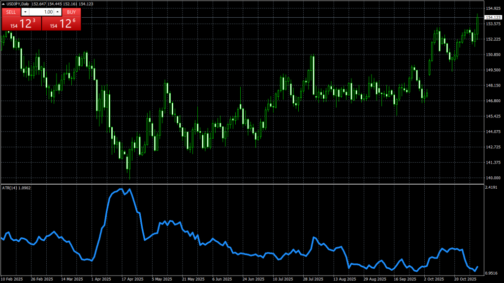 - ATR:ATRのグラフが上昇していればボラティリティが高まっていることを、下降していればボラティリティが低下していることを意味します 。ATRはその時点の相場における「平均的な値幅」を教えてくれるため、損切り幅や利食い幅を設定する上で極めて実践的な基準となります。