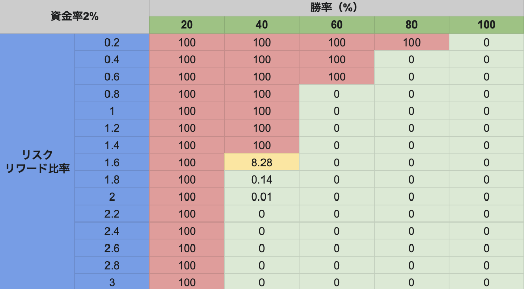 「高勝率=安全」という考え方がいかに危険であるかを、バルサラの破産確率を用いて具体的に見てみましょう。以下の表は、資金率を「2%」に固定した場合のバルサラの破産確率を表したものです。